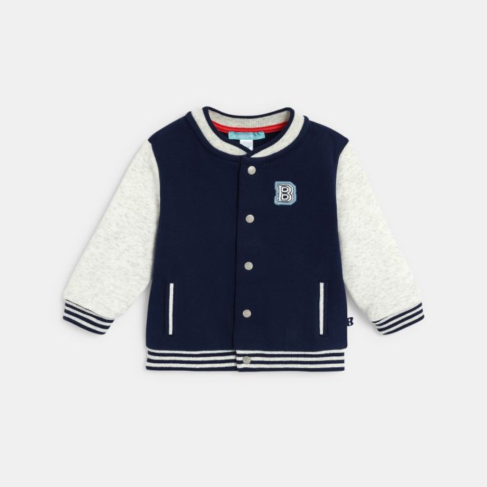 Baby boy's blue baseball-style jacket with whale patch