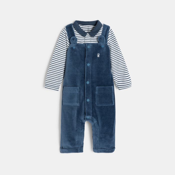 Baby boy's long velvet dungarees and blue striped bodysuit