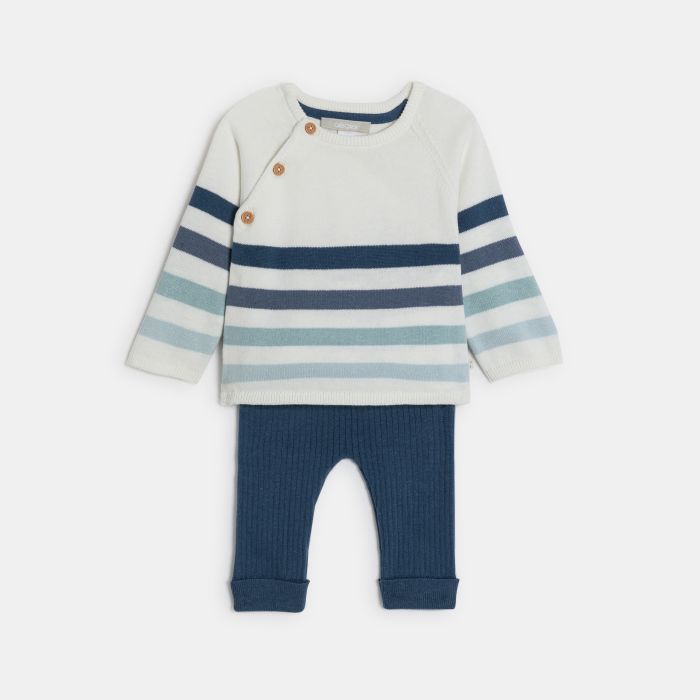 Baby boy's striped knitted jumper and blue rib knit trousers