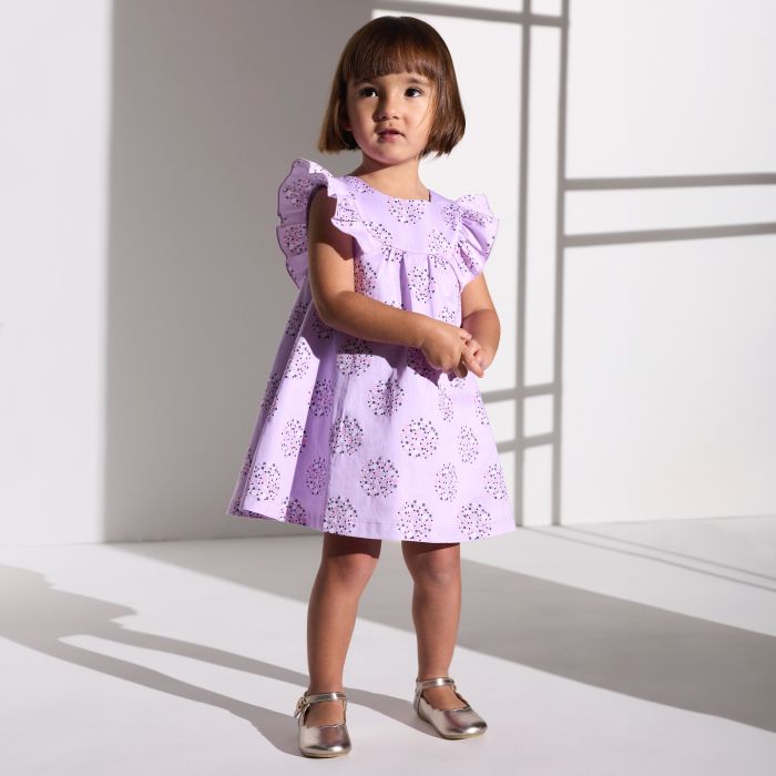 Flowers for little girls! Your little one will be super comfy on hot days in this loose, lightweight dress. We love the ruffles on the neckline and the sleeveless style. Fastens at the back for easy dressing. Bloomers with elasticated thighs and waist included from 3 months to 23 months.