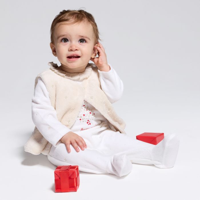 Baby girl's white velvet sleepsuit with beige gilet