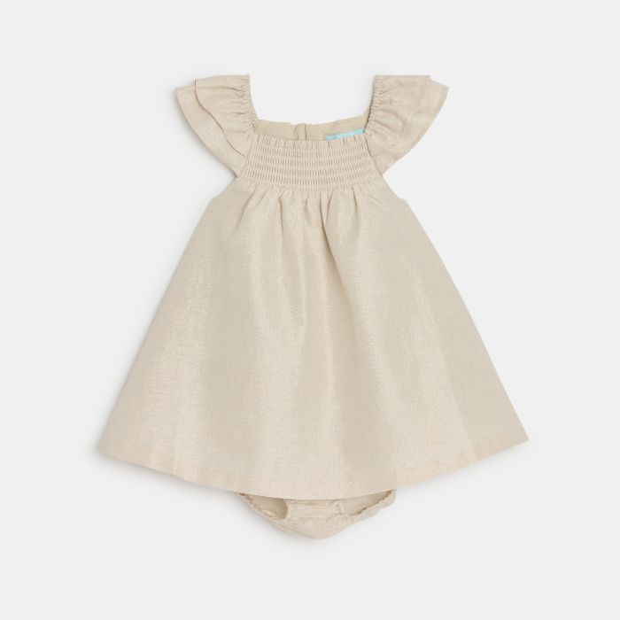 Gold dress in sparkling fabric, ideal for special occasions. Flared cut with ruffled armholes for an elegant look. Soft lining for total comfort. Easy to pull on. Perfect for dazzling at celebrations and parties.