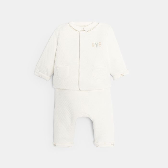 Baby's unisex reversible quilted jacket and trousers with white bodysuit