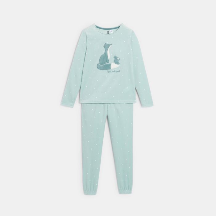 Girl's blue 2-piece velours pyjamas with a fox and rabbit motif