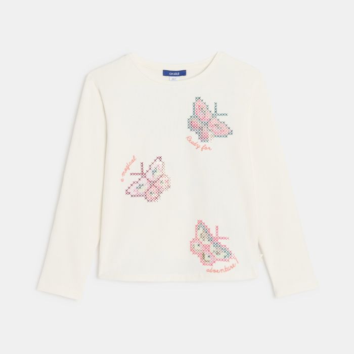 Girl's ecru long-sleeve T-shirt with butterfly motif