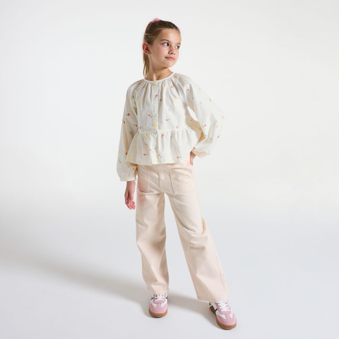 Little girls will be quick to fall in love with this blouse: embroidered flowers, a flared shape with ruffles and long puffed sleeves. Button fastening and wide neckline so it's easy to slip on.