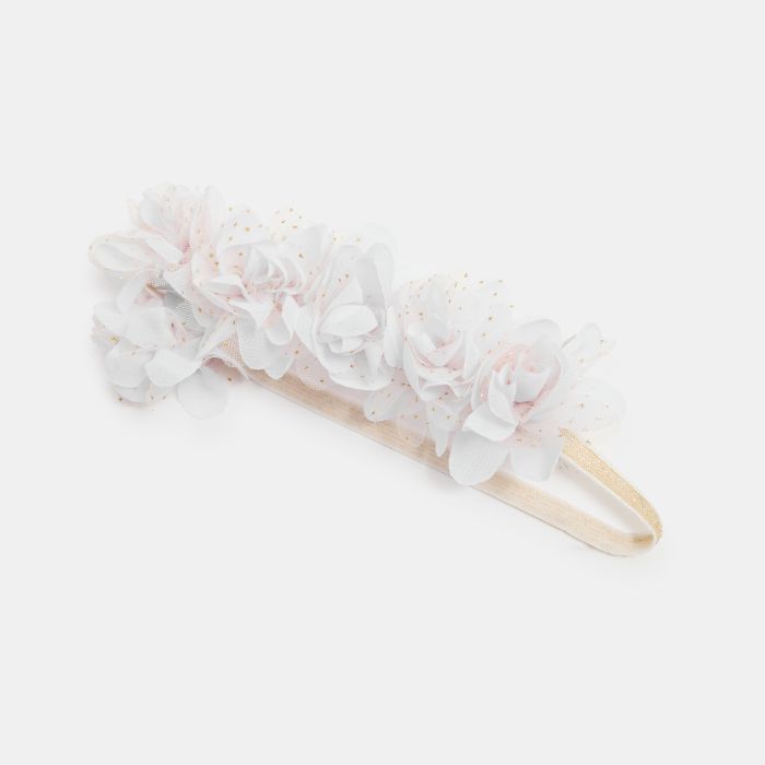 Fall for this white headband, delicately adorned with fabric flowers and gold accents. Made from a soft, stretchy fabric for optimum comfort. Perfect for enhancing an outfit for a special occasion.