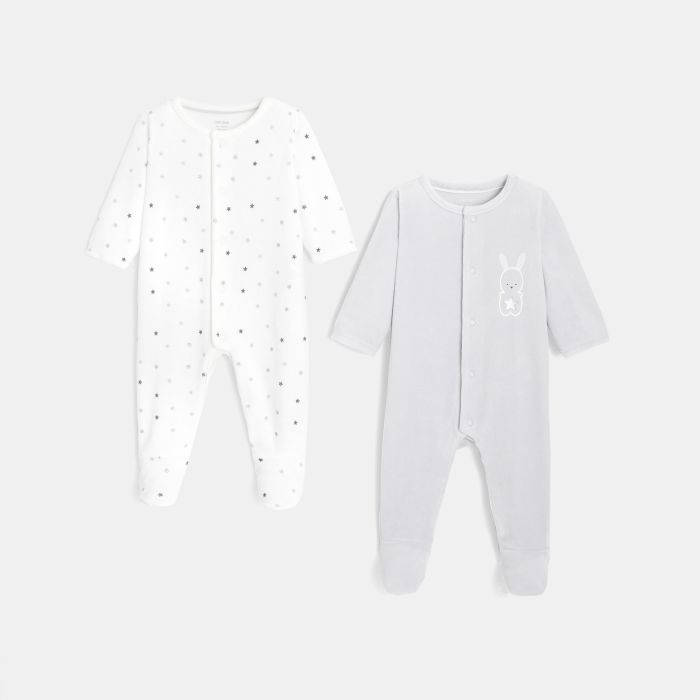 Unisex footed sleeper-style pajamas for babies. Set of 2 assorted footed sleepers: one in gray velvet knit with a rabbit anim'Obaïbi motif + one in velvet knit with allover printed stars, sparkly hint. Round neckline with a full-length stomach opening with snap-fasteners from the collar to the crotch. Small Obaïbi print on the neckline in back.